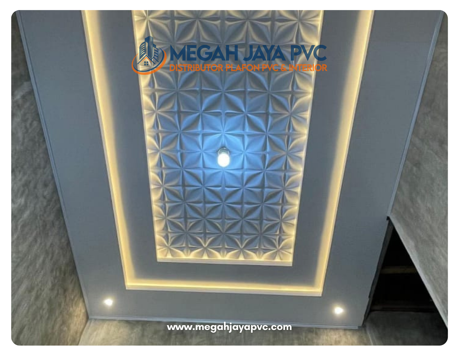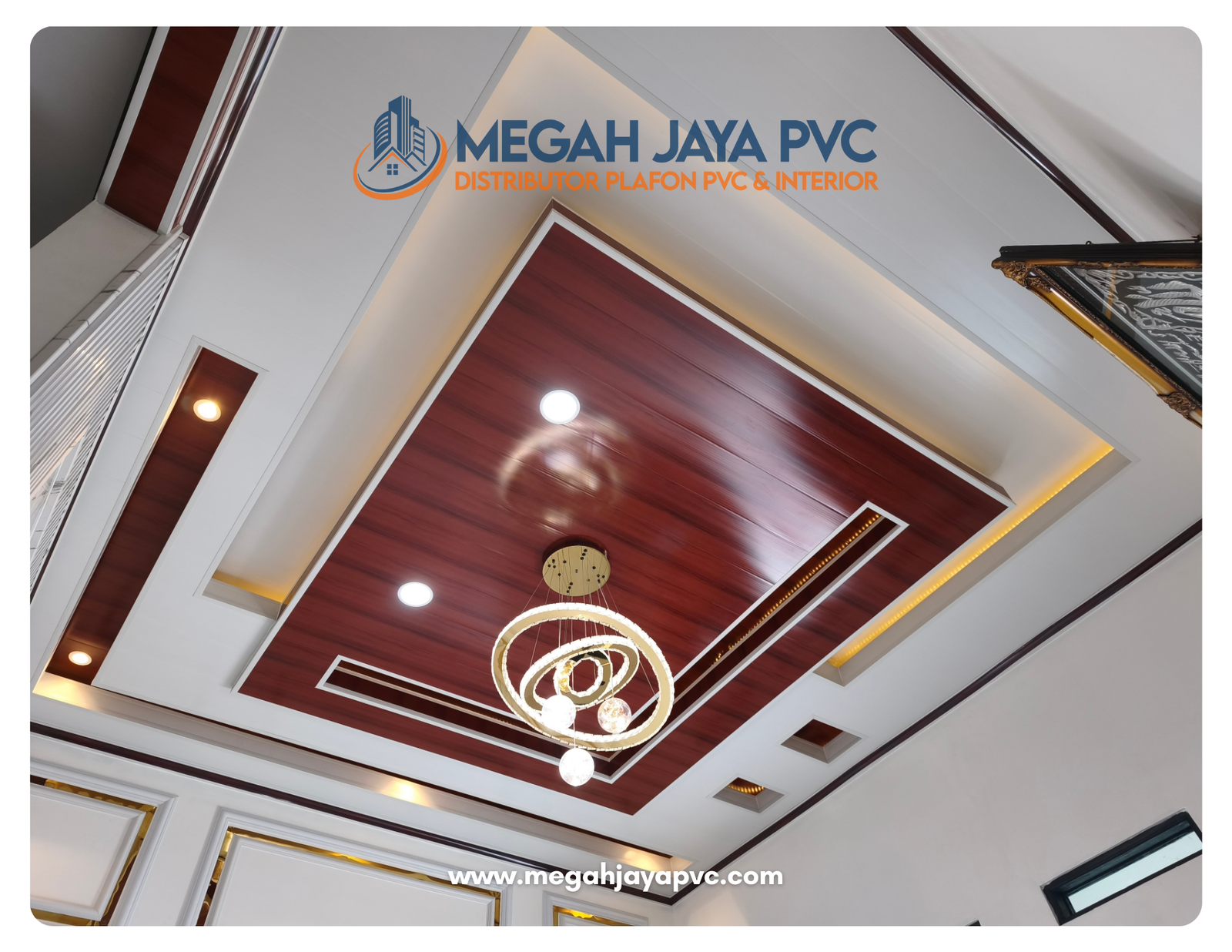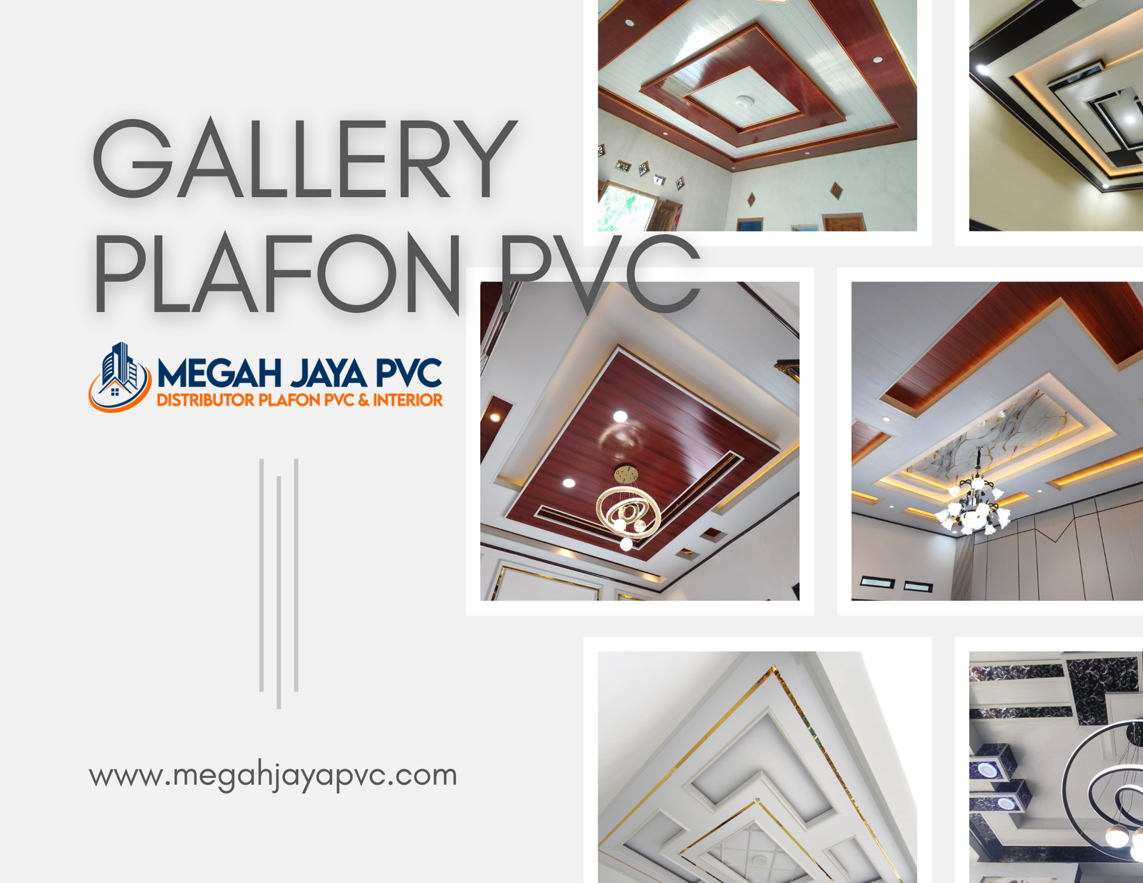DISTRIBUTORPLAFON PVC& INTERIORPlafon Plihan Orang Pintar More Info Tentang KamiMEGAH JAYA PVCDistributor plafon PVC dan solusi interior terpercaya. Menyediakan produk berkualitas, pemasangan profesional, dan layanan untuk rumah, kantor, hingga proyek komersial dengan hasil rapi, elegan, dan tahan lama. Produk Katalog All PVC Gloss PVC Doff Pick Up Toko Melayanai Pengirman sejabodetabek Bergaransi Produk berkualitas & Bergaransi Online Support Layanan Kosultasi Gratis System Pembayaran Pembayaran Via Transfer atau Cash Gallery Plafon PVCPlafon PVC premium dengan tingkat kepdatan dan ketebalan 8mm